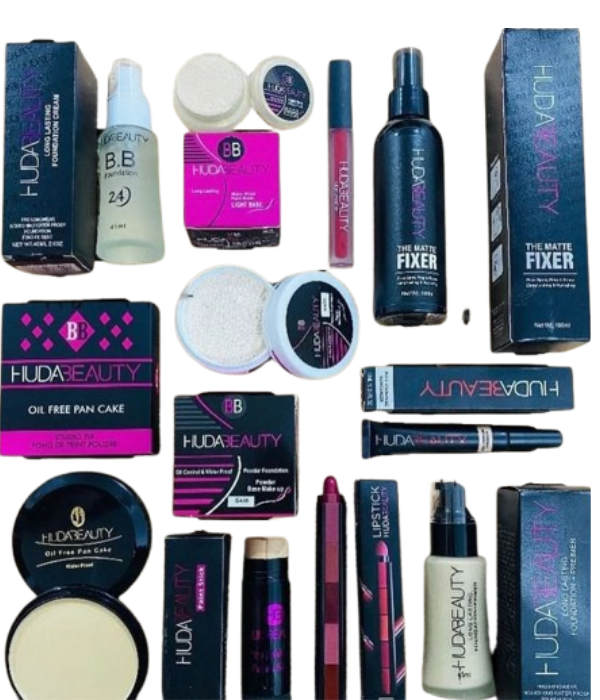 Elevate your beauty game with this 10-in-1 Huda Beauty makeup bundle! Featuring everything from vibrant eyeshadows, foundation, waterproof mascara, and long-lasting lipsticks, to essential tools like a makeup sponge and setting spray. Achieve a flawless, long-lasting look with this complete beauty package!